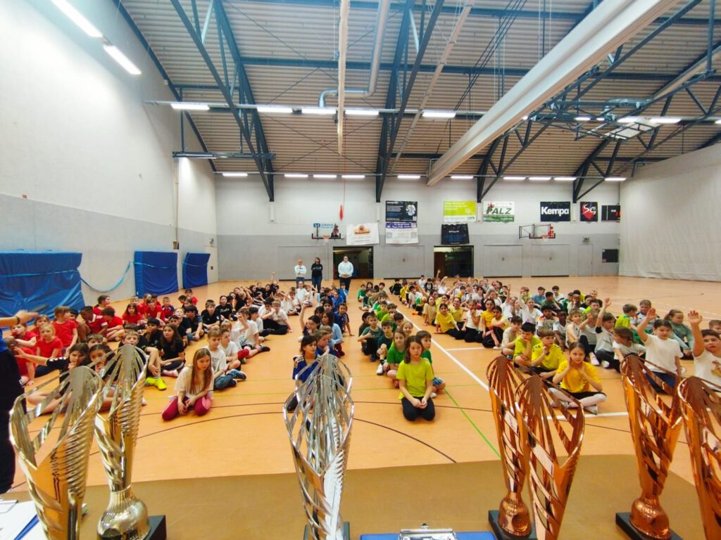 Am 18. Februar war es wieder einmal so weit: der vielseitige Mannschaftswettbewerb der dritten und vierten Jahrgänge stand auf dem Plan. Dazu trafen sich alle 8 Klassen in der Vierfachturnhalle am Felderhof und wollten mit viel Engangement und Einsatzwillen Punkte für die Klasse erzielen. Nachdem im Vorfeld bereits zwei Disziplinen im Bereich des Schwimmunterrichts abgenommen wurden, ging es an diesem Tag um Punkte im Turnen, Sozialberg, Biathlon sowie dem Mannschaftsspiel „Ball über die Schnur“. Mal wurden Expertenteams ins Rennen geschickt, mal war die ganze Klasse gemeinsam gefordert ihr Bestes zu geben. Nach einem langen, intensiven und hart umkämpftenVormittag standen schlussendlich die Platzierungen fest: